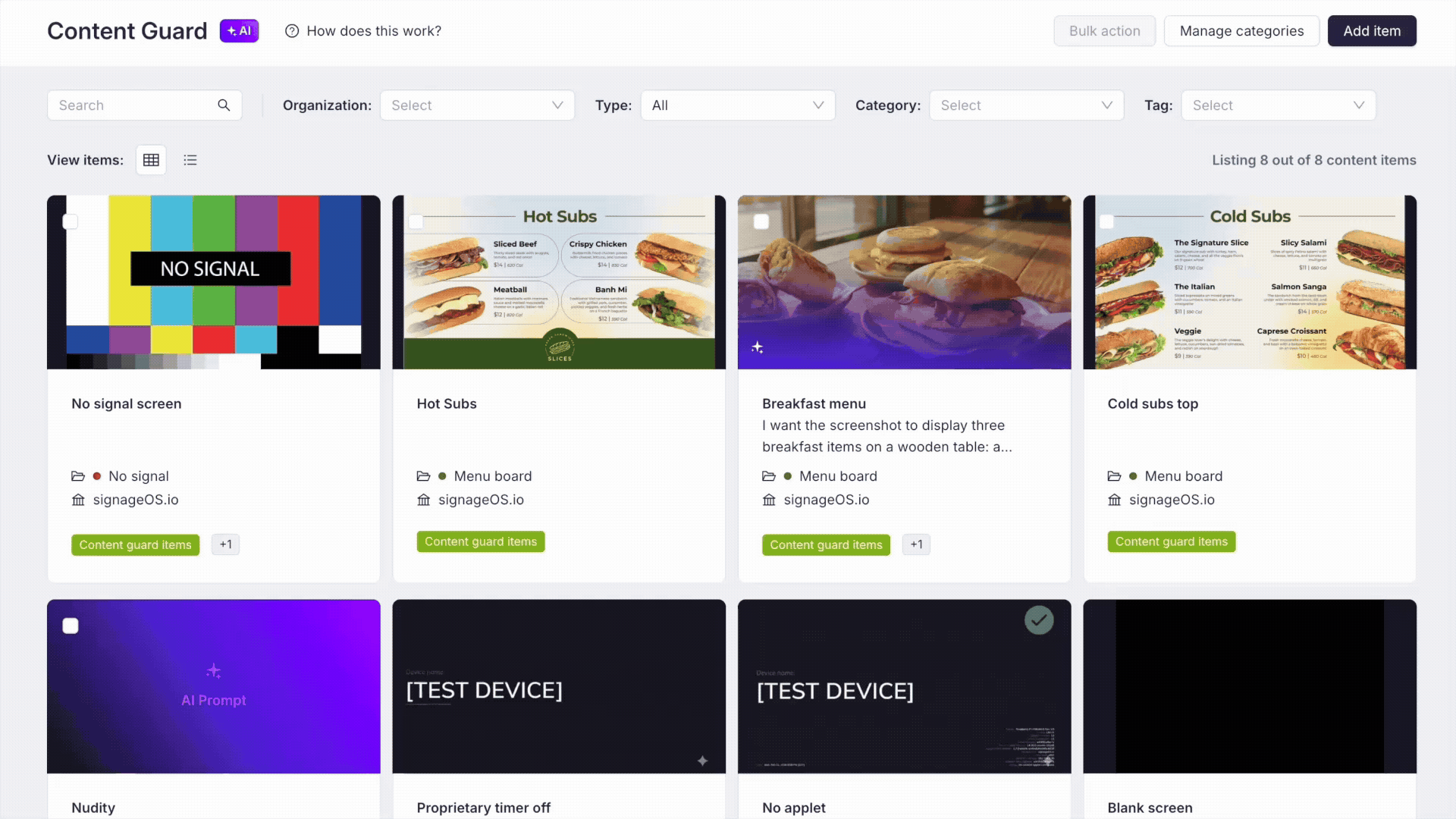 Content Guard is your automated content watchdog. Using advanced image analysis and Artificial Intelligence, it constantly monitors screenshots from your devices and automatically classifies them into categories. If it detects an error or prohibited content, it notifies you instantly.